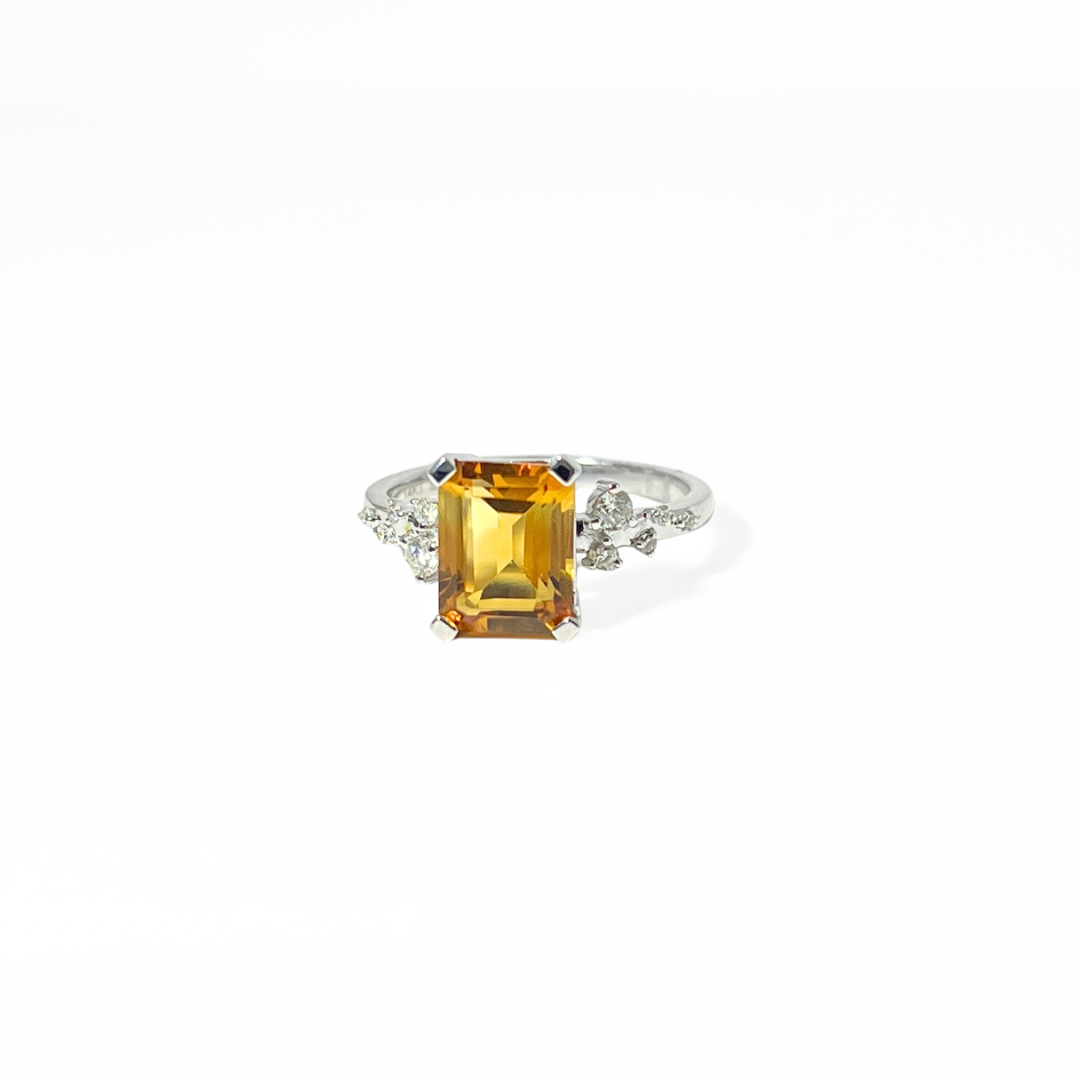 Anillo de citrina y diamantes naturales en oro blanco 14K