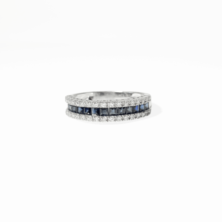 Churumbela con zafiros en corte princesa y diamantes naturales corte redondo en oro blanco 14K